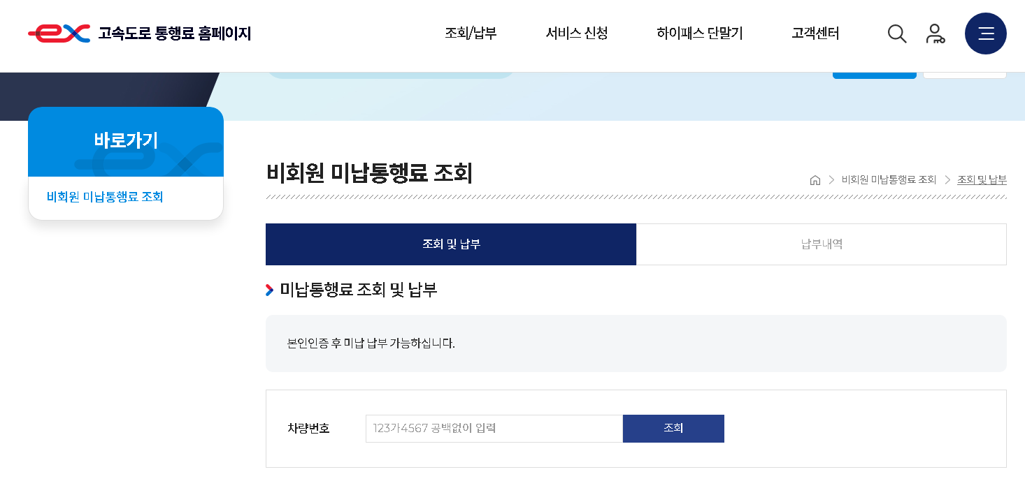차량 번호만으로 미납 통행료 간편하게 조회하세요! 미납 통행료가 있는 경우 본인인증 후 납부 가능합니다.