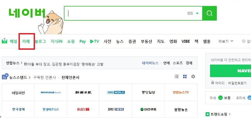 먼저 컴퓨터에서는 보통 네이버 공식 홈페이지에서 카페로 바로가기를 하신 이 후에 로그인을 하는 과정을 거쳐서 이용하게 됩니다. 이는 모바일에서도 마찬가지인데요.