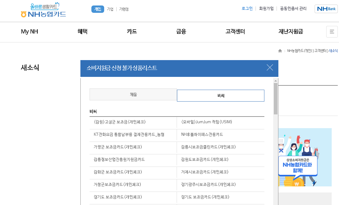신청 가능 카드는 농협 채움 카드와 농협 BC 카드로써 지원되는 카드 목록을 상세하게 확인이 가능합니다. 신청 가능 날짜가 되면 해당 페이지를 통하여 카드번호나 휴대폰 인증을 통하여 신청을 진행할 것 같습니다.