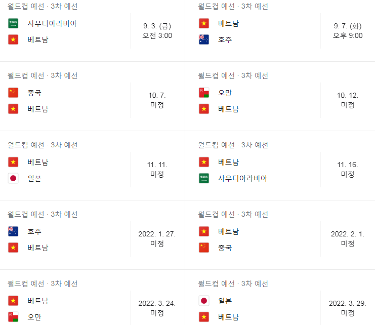 그 이후에는 3월까지 일정이 잡혀져 있는데 각각 홈과 원정에서 한국가당 2번의 경기 총 10경기가 확인됩니다. 해당 경기들의 중계는 베트남TV인 VTV를 통하여 확인이 되어지는데요.