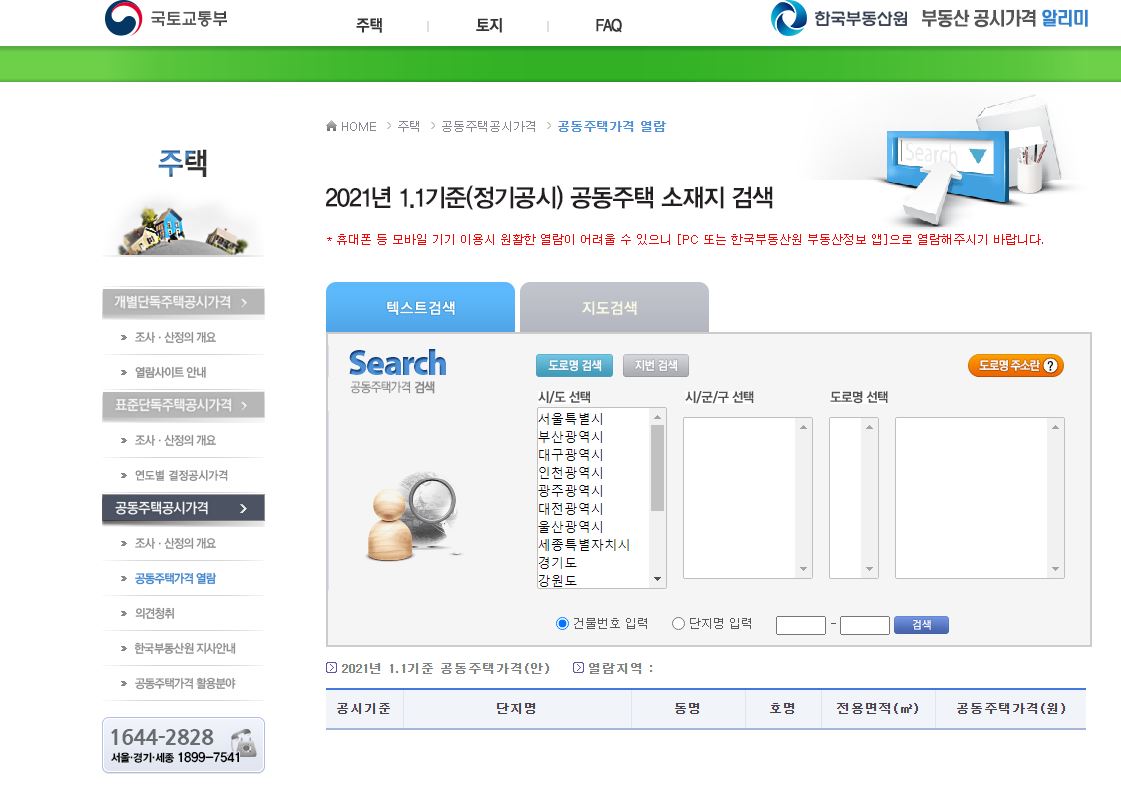 이곳에서는 공동주택, 표준단독주택, 개별단독주택에 대한 공시가격이 열람가능하다고 합니다. 더불어 표준지 공시지가와 개별 공시지가도 보실 수 있습니다.
