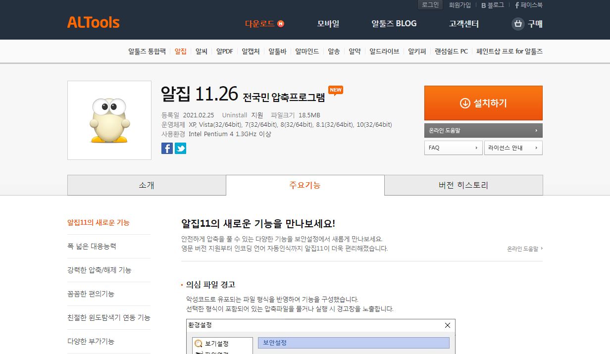 알집의 다운로드는 ALTools 홈페이지를 통해서 진행이 가능합니다. 다운로드 센터 자료실을 이용하시면 다른 시리즈의 프로그램과 더불어서 압축프로그램을 확인하실 수 있구요. 설치하기를 이용하여 파일을 받으실 수가 있습니다.