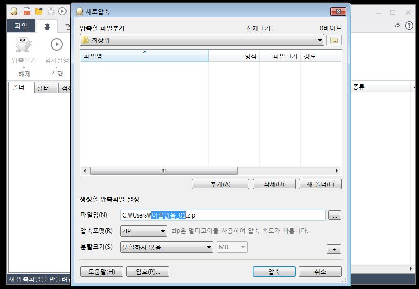 압축하기를 하실 때에는 압축포맷을 선택하실 수 있구요. 분할압축이나 암호 넣기가 가능합니다. 더불어 압축방법이나 언어지원도 세팅을 하셔서 원하는 환경에 맞는 파일을 생성하실 수 있습니다.