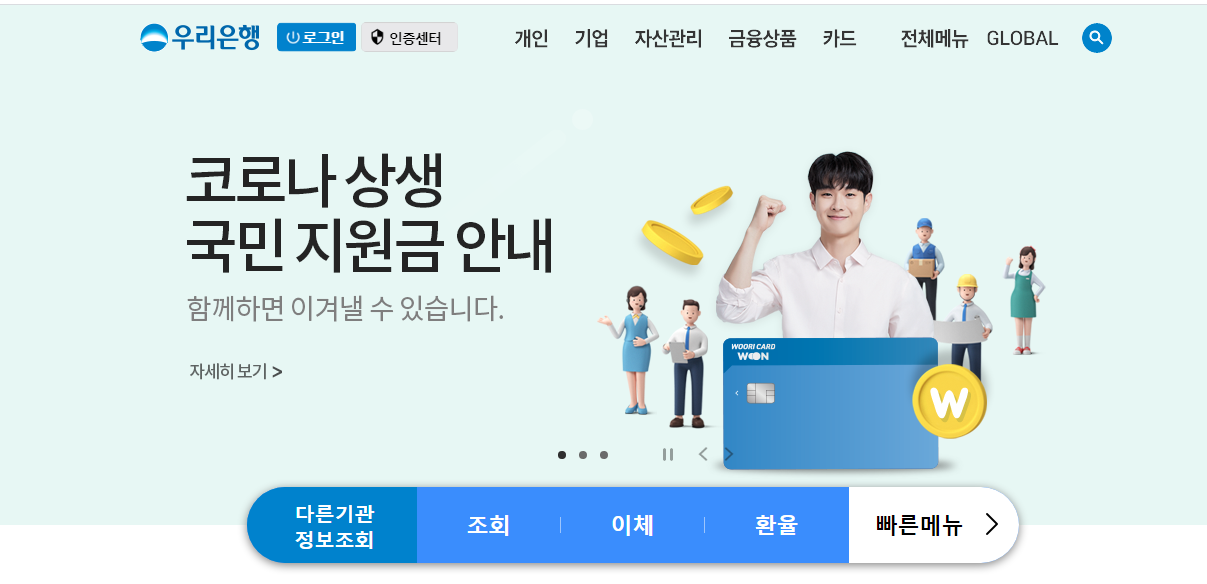 이 중에서 컴퓨터에서 이용 가능한 홈페이지는 로그인을 하시고 조회, 이체, 환율, 자산관리 등의 서비스를 이용하실 수 있습니다. 거기에 최근에는 코로나 상생 국민 지원금도 신청에 관련된 서비스도 진행되고 있다고 하네요.