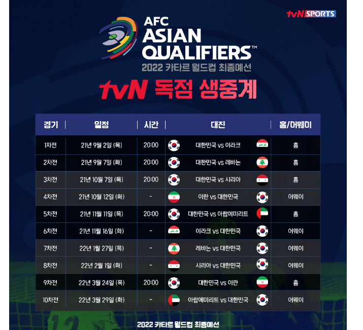 중계권이 넘어가서 이제는 독점으로 tvn 축구 중계 방송을 통하여 생중계로 보실 수 있다고 합니다. 여기서는 한국 국가대표 축구 경기 뿐만아니라 다른 아시아쪽 재미있는 경기도 시청이 가능한 것으로 보이네요.