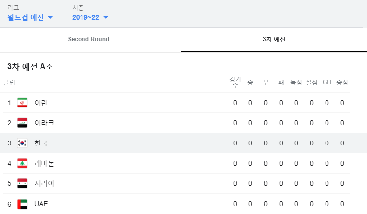 한국 같은 경우는 월드컵 3차 예선에 A조에 속해져 있는 상황인데요. 이란, 이라크, 레바논, 시리아, 아랍에미리트와 한 조로 경쟁을 하게 됩니다. 전부 중동팀이라고 할 수 있기 때문에 쉽지 않은 것 같습니다.