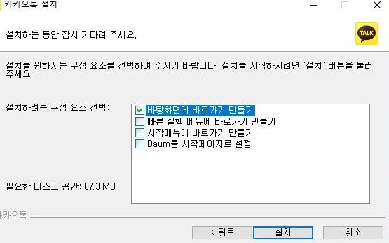 받으신 카카오톡 설치 프로그램은 마법사를 이용하시면 간단하게 설치를 마치실 수 있습니다. 필요한 디스크 공간이 그다지 크지가 않기 때문에 용량이 얼마 없으셔도 무방합니다.