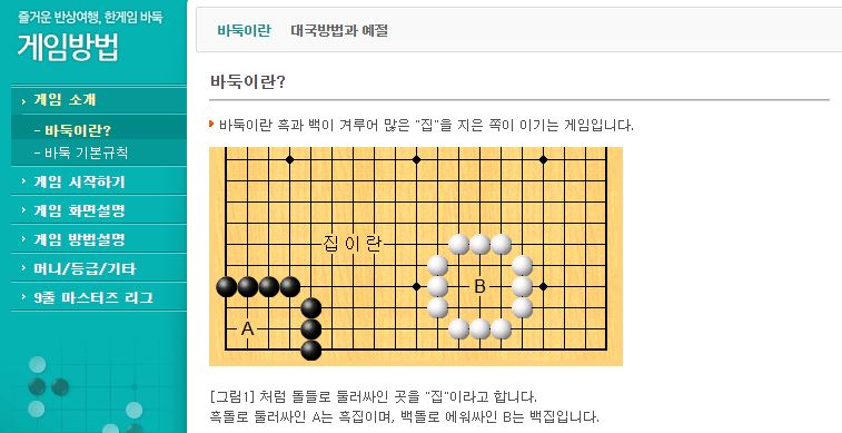 이 부분은 한게임 바둑의 홈페이지에서 제공을 하고 있는 바둑사전 특히 입문용어사전이나 게임방법을 참고하시면 좋을듯 싶습니다. 다만 바둑사전은 구버전의 익스플로러 브라우저에서만 열리고 크롬에서는 열리지 않았는데요. 이 부분은 개선이 되었으면 하는 바람이 있었습니다.