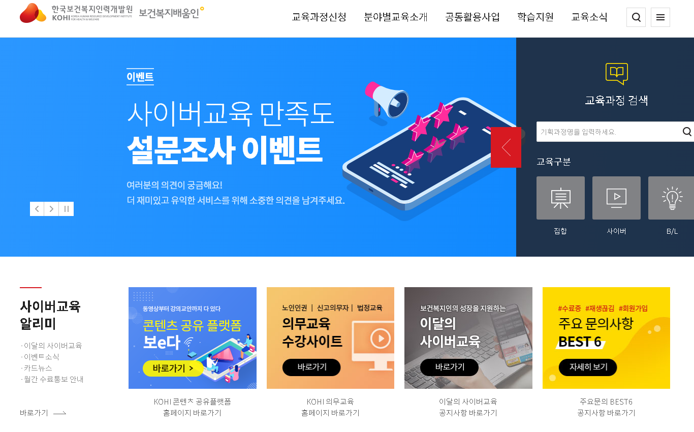 들어가보시면 kohi의 대표 사이버교육센터인 보건복지배움인으로 연결이 되어집니다. 보건 복지분야의 다양한 교육과정을 다양하게 확인할 수 있는 통합교육원 페이지로써 이용가능한데요.