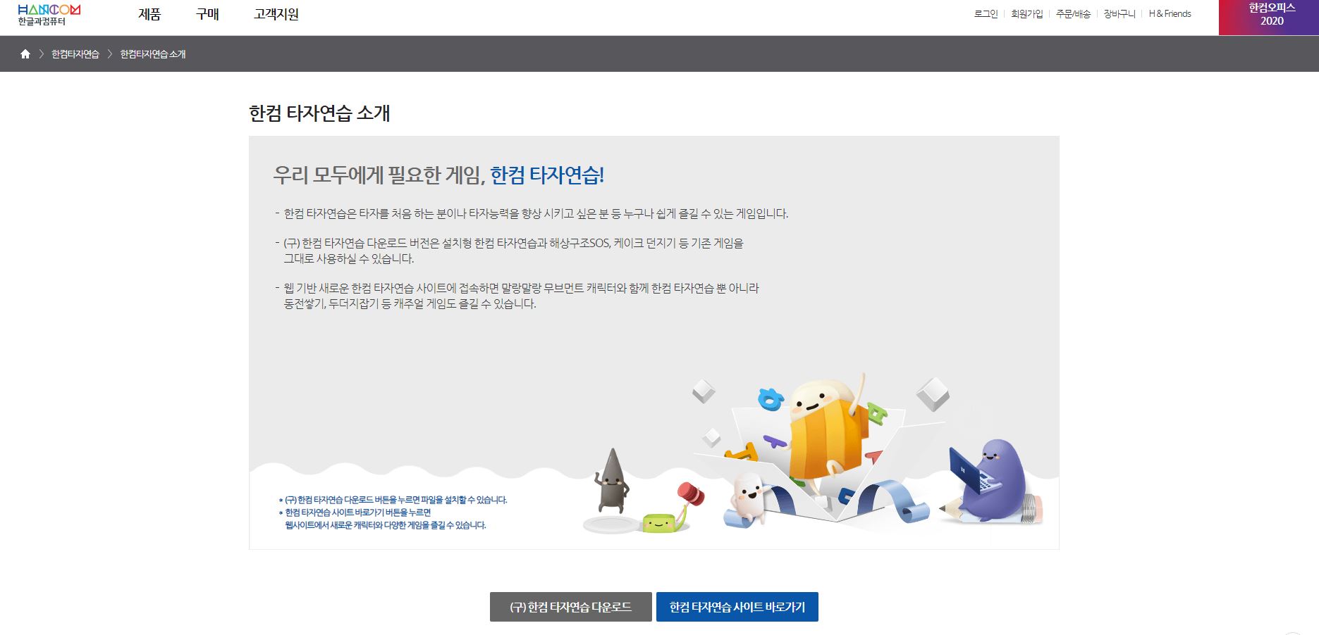 그럼 하나씩 한컴 타자 연습을 사용하는 방법에 대해서 알아보도록 하겠습니다. 우선적으로 구버전으로 다운로드를 받는 방법에 대해서 살펴보면 한글과컴퓨터 홈페이지를 이용해 보시면 되는데요.