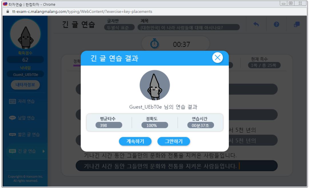 웹에서 사용이 되어지는 버전에서도 마찬가지로 자리 연습, 낱말연습, 짧은글/긴글 연습이 가능하였는데요. 여기서도 긴글로 연습을 해보니 400타 정도가 나오는 것 같습니다. 아무래도 웹 버전이다보니 인식속도는 프로그램에 비해 느린 것 같았어요.