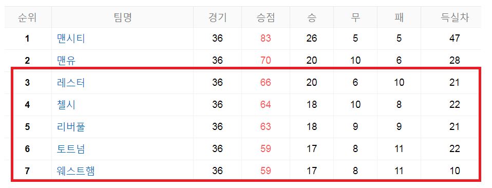 그러나 마지막 순위 경쟁을 하는 팀들이 있습니다. 바로 다음시즌 챔피언스리그 본선 직행을 다투는 3~4위 자리가 확정이 되지 않았기 때문인데요. 맨유는 남은 경기 일정에 상관없이 4위 안에는 무조껀 들게 되었지만 레스터와 첼시는 남은 경기에서 승점을 드랍하게 된다면 뒤의 팀들에게 다음시즌 챔스 직행권을 넘겨줘야 할 수가 있습니다.