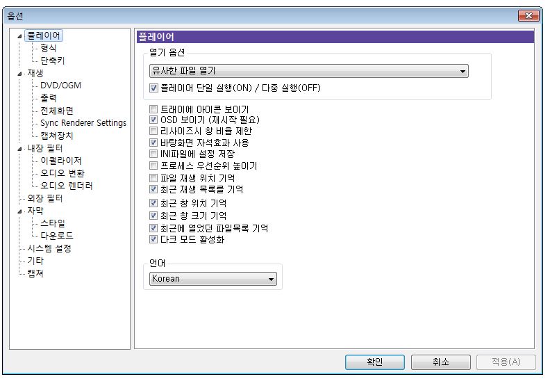 여기에서 마우스 우클릭을 통하여 나오는 메뉴를 이용하여 파일을 열어주시거나 여러가지 설정을 바꾸어주실 수 있습니다. 특히나 옵션에서는 플레이어, 재생, 내장 필터, 외장 필터, 자막, 시스템 설정, 캡쳐 등에 대한 옵션을 바꾸실 수 있어요.