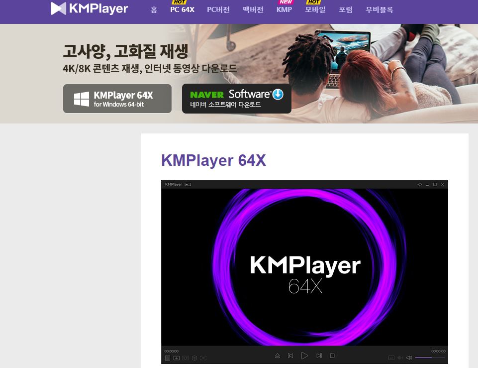 공식홈페이지인 kmplayer닷컴에 접속을 해보시면 PC버전으로 32비트, 64비트, 맥버전이 배포가 되고 있구요. 모바일용으로는 오직 비디오 재생을 위한 가벼운 애플리케이션인 비디오 플레이어 KMP와 정식 모바일 앱을 확인하실 수 있습니다.